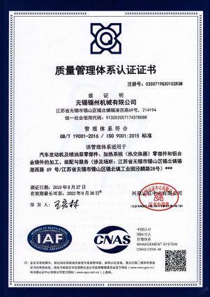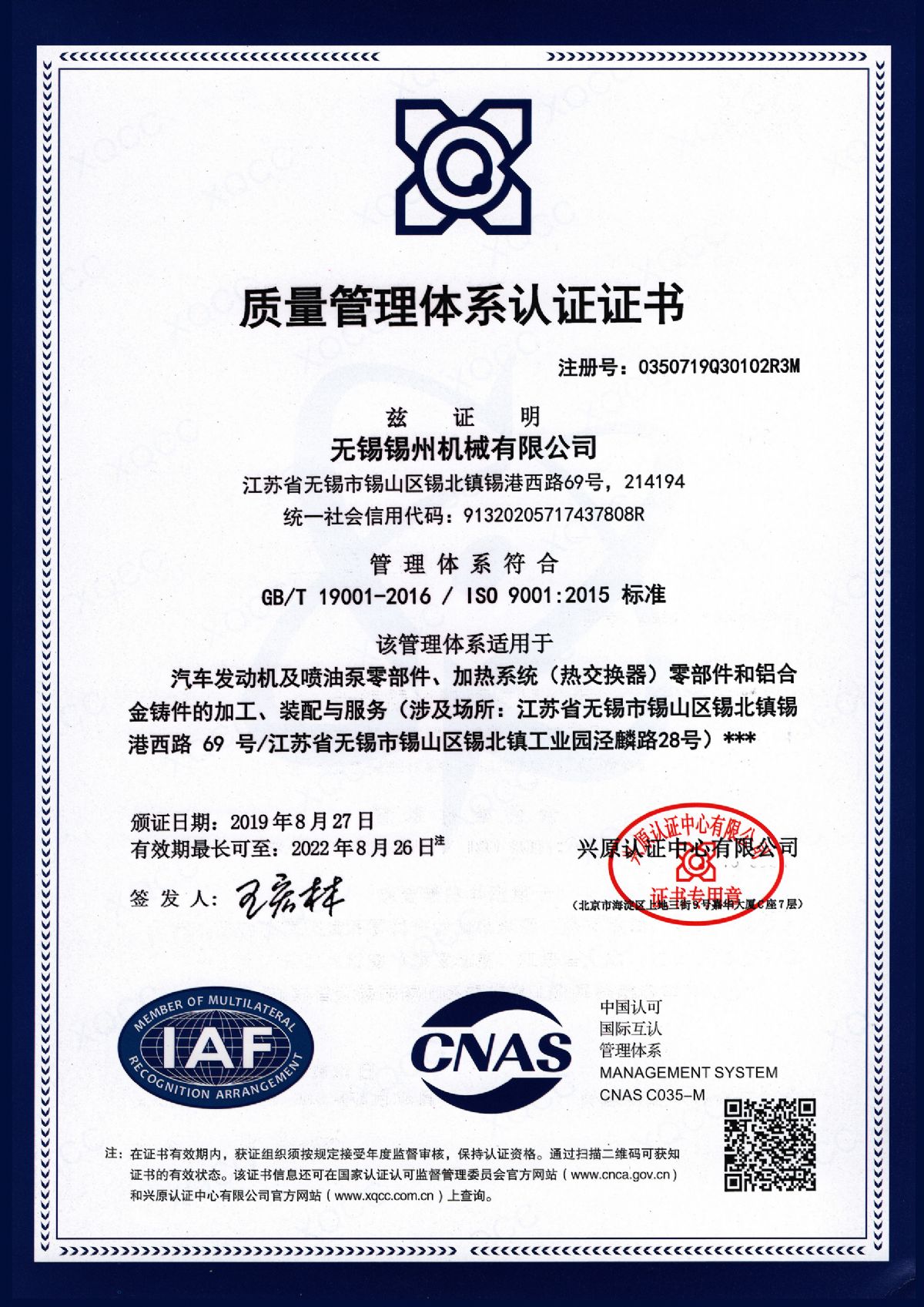 “ 以質(zhì)量求生存,以管理增效益”是錫州機(jī)械堅(jiān)定不渝的經(jīng)營理念;“質(zhì)量第一、客戶至上”是錫州機(jī)械堅(jiān)持不懈的追求;“ 以人為本,鑄就優(yōu)質(zhì)產(chǎn)品, 精益求精,增強(qiáng)顧客滿意”是錫州機(jī)械持之以恒的質(zhì)量方針。 2001年7月公司通過ISO9001:2000質(zhì)量體系認(rèn)證, 2005年9月通過ISO/TS16949質(zhì)量體系認(rèn)證。公司于2007年7月通過產(chǎn)品ASME認(rèn)證。 通過開展以產(chǎn)品質(zhì)量為中心的企業(yè)管理,公司以先進(jìn)的生產(chǎn)檢測設(shè)備、完善的質(zhì)量保證體系、嚴(yán)密的產(chǎn)品開發(fā)體系、嚴(yán)格按照標(biāo)準(zhǔn)開展產(chǎn)品生產(chǎn)管理,并開展6S現(xiàn)場管理,竭盡全力創(chuàng)造一個(gè)比較清潔、健康、安全的環(huán)境,全方位地滿足國內(nèi)外客戶的要求。